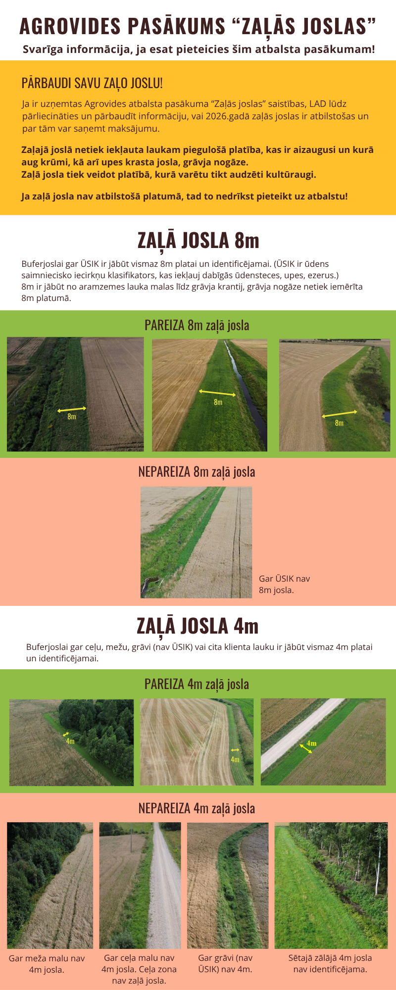 Ja tiek veidota 8 metri plata zaļā josla, tad buferjoslai gar ŪSIK ir jābūt vismaz 8m platai un identificējamai: 8m ir jābūt no aramzemes lauka malas līdz grāvja krantij, grāvja nogāze netiek iemērīta 8m platumā.