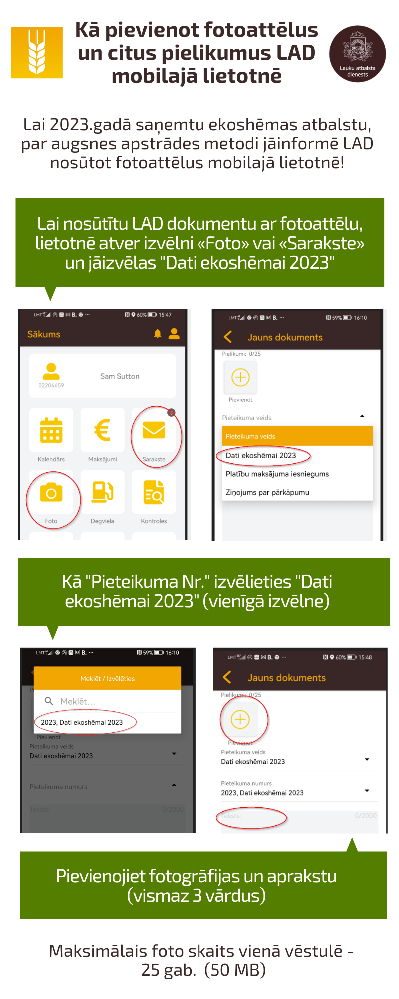 Fotoattēlus jāsūta, izmantojot tikai LAD mobilo lietotni. Tos var sagatavot arī ar droniem, svarīgi, lai uz foto būtu redzama laika un vietas atzīme. Laukus var fotografēt konkrētā laikā, bet sagatavotos fotoattēlus sūtīt pēc tam no biroja vai mājas – svarīgi, lai arī šādu iepriekš sagatavotu fotoattēlu sūtīšanai tiktu izmantota LAD mobilā lietotne.