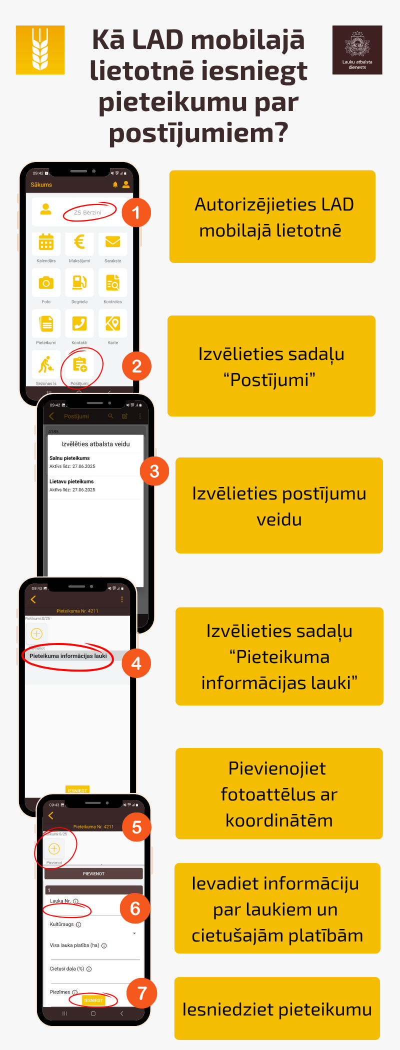 Aicinām informāciju iesniegt LAD mobilajā lietotnē, lai attēli ar ģeotelpiskajām koordinātēm tiktu pievienoti pieteikumam.