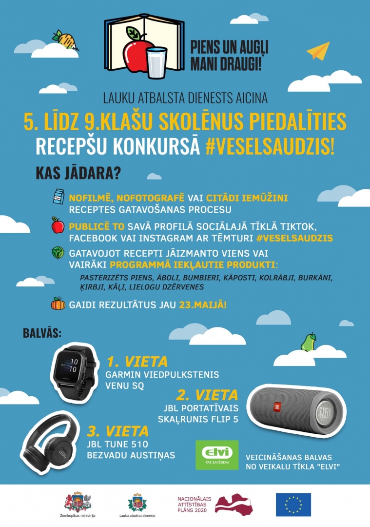 Lauku atbalsta dienests aicina 5. līdz 9.klašu skolēnus no 25.aprīļa līdz 18.maijam piedalīties recepšu konkursā #veselsAUDZIS, lai popularizētu programmu “Piens un augļi skolai”, kā arī veicinātu veselīga uztura lietošanu ikdienā. Bērniem individuāli jāsagatavo interesanta recepte, izmantojot pienu vai programmā iekļautos dārzeņus un augļus, kā arī tā jānopublicē kādā no populārākajiem sociālajiem tīkliem, tostarp TikTok, Instagram vai Facebook, izmantojot tēmturus #veselsAUDZIS un #LAD. Receptes vērtēs kompetenta žūrija, kurā iekļauti dažādu jomu pārstāvji, piemēram, uztura speciālists, pediatrs u.c.